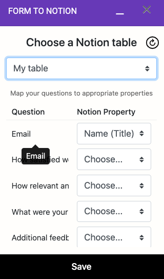 원하는 테이블을 선택하고 Question (구글 설문지의 질문)과 Notion Property (노션 데이터베이스의 속성)을 연결해주세요. 이 부분 때문에 미리 속성을 만들어 놓는 것을 추천드립니다.