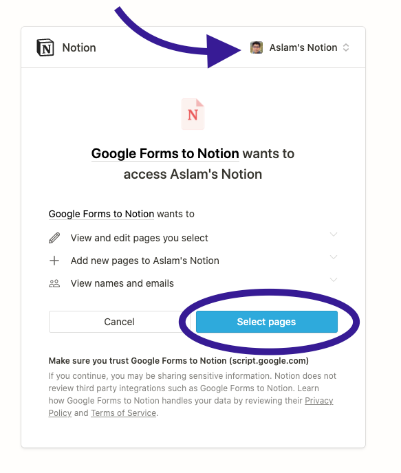 △ 연동하고자 하는 Workspace 를 확인하고 Select Pages 를 눌러줍니다.