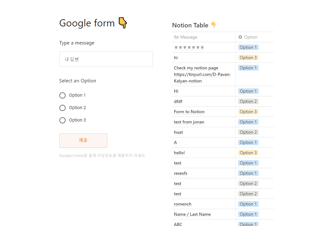 위의 데모 페이지처럼 설문지를 노션에 Embed 할 수도, 설문지에 응답이 추가되면 노션 데이터베이스 테이블에도 추가되도록 연결할 수도 있습니다.